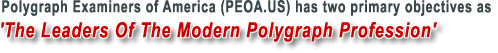 PEOA provides examiners with exam referrals, a world-wide Internet member-to-members communication listserve, the latest information and techniques, job announcements, trends and advancements, and affordable continuing education, that could give you a competitive edge in the polygraph profession. There are no self-serving requirements; no 'good old boys', 'superiority', or 'closed shop' treatment or attitudes. We are larger than all state polygraph associations COMBINED; and unlike the steady shrinking of most polygraph organizations, we grow larger and more valuable year after year. No 'BS', 'chit-chat', 'diet plans', 'cooking recipes', or 'drama': serious lie-detection business only!